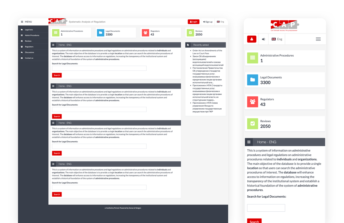 Netgen wurde als Technologiepartner in 8 Ländern engagiert, angefangen in Ägypten im Jahr 2008. Ziel war es, eine Webanwendung mit einer einfachen Schnittstelle für die Verwaltung von Dossiers zu entwickeln, die von Arbeitsgruppen für die Reform von Rechtsvorschriften und anderen Akteuren des öffentlichen Sektors genutzt wird, sowie eine öffentliche Schnittstelle zur Information und Einbindung von Bürgern und Unternehmen. Wir haben die Anwendung verbessert, als sie auf neue Länder wie Armenien, Kirgisistan und Thailand ausgeweitet wurde.