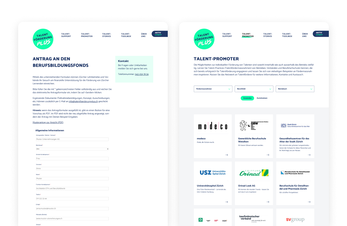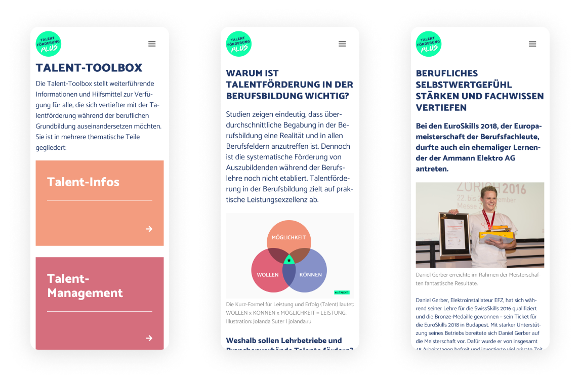 Die user-freundliche Website im responsive Design ist Hauptkommunikationskanal der Sensibilisierungskampagne. Die Website ist so strukturiert, dass die Benutzer*innen schnell und intuitiv an die benötigten Informationen gelangen können. Sie stellt den Betrieben alle Informationen zur Verfügung, die diese zur Förderung von Talenten befähigen. So zum Beispiel Inspirationen, Dokumente, eine umfassende Liste mit Wettbewerben, etc. Die Website besteht im Wesentlichen aus den folgenden Elementen: