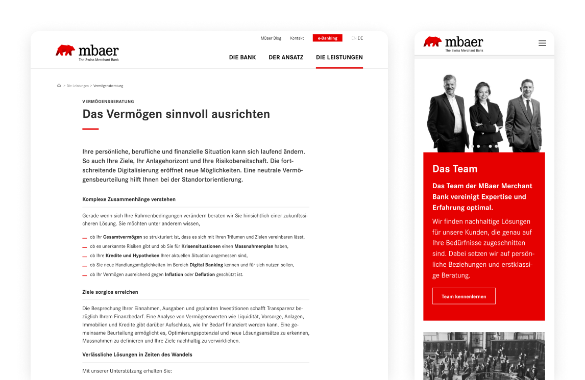 The central concern was that all potential customers should be able to find their way around the website and easily locate the service and contact person relevant to them. Accordingly, the menu item "The Services" is structured according to needs and service categories to ensure intuitive navigation to the relevant offer. Under "The Bank" and "The Approach", information can be found on the history and origins, the team, or the advisory approach of the bank.