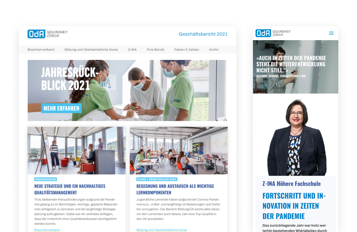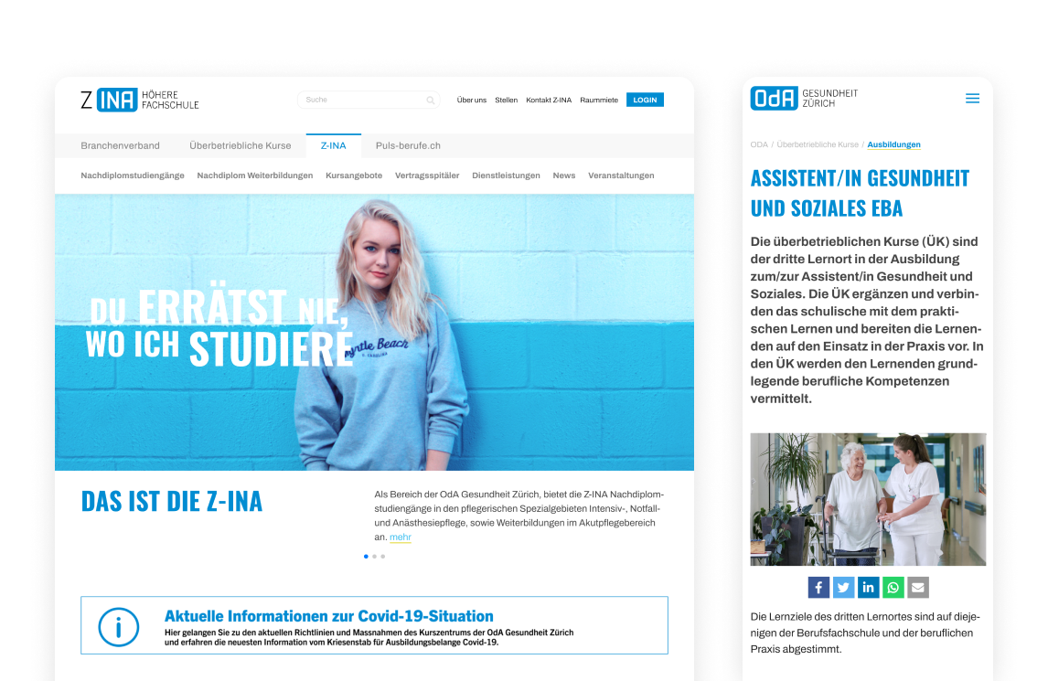 The first step was to review the existing websites https://oda-g-zh.ch and https://z-ina.ch, which were previously managed on different instances, into one CMS (eZ Platform). The existing independent URLs should be kept under the same umbrella.